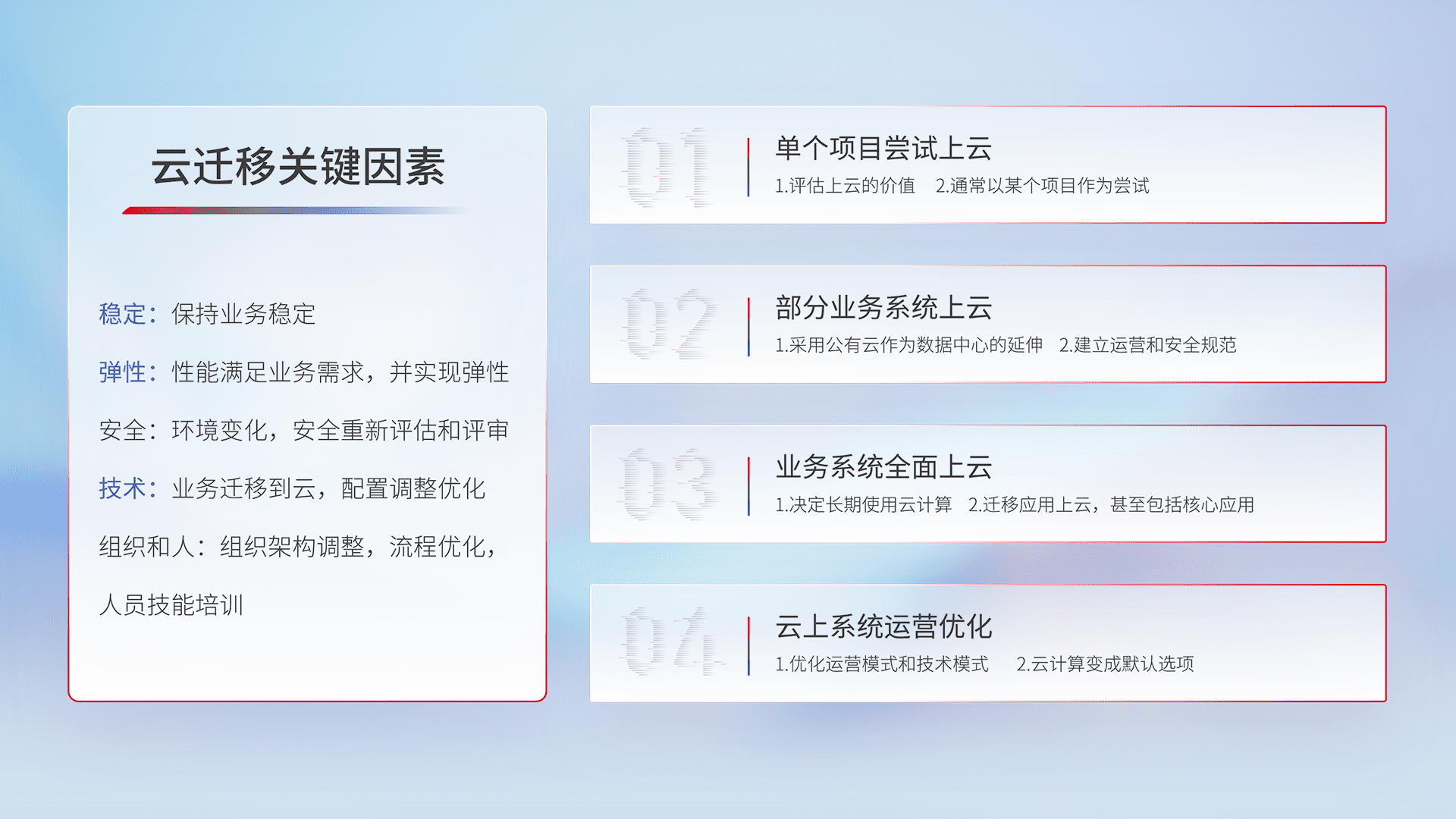 结合实际业务,,,从规划设计、、云平台选型、、、、云原生改造、、、数据迁移、、集成交付,,迁移全过程为客户识别最佳上云路径,,,做好风险识别管理,,设计网络架构、、、、身份权限、、、安全审计合规、、、操作审计、、日志审计、、、、监控告警策略、、、多站点容灾设计等,,,,对云上基础设施进行整体规划,,,,提升IT治理水平,,,,以满足弹性、、、、高可用、、、高性能的需求。。