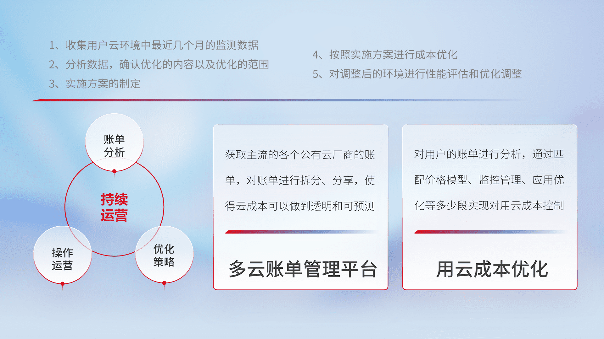通过多云纳管,,以统一的资源数据模型把客户的云资源进行抽象和封装,,,,进而实现对多云资源的统一操作,,,,保障云资源管理的可靠性、、、、稳定性与可用性。。量身定制化运维内容,,,,配置、、开发运维、、、、补丁管理、、、备份、、监控、、、、认证和访问管理、、、、审计和日常巡检等,,,保障在用云过程中的可靠度,,稳定度以及高可用率。。